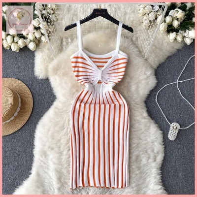 HB3639 Women's Dress Beach vacation suspender dress V-neck stripes high-end wear A-line skirt