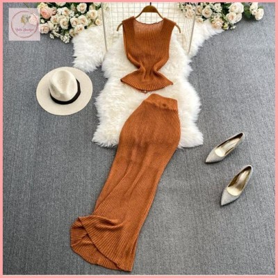 HB6285 Women's coords style retro zipper knitted suit short sleeveless top women's high waist fitted trousers flared pants