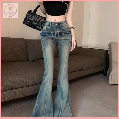 HB5811 Women's street retro jeans summer belt design high waist flared trousers