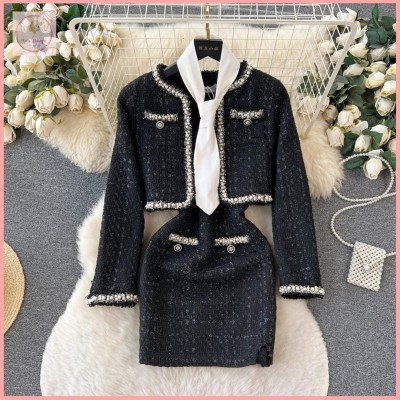 HB6218 Women's set tweed for fashion short beaded jacket suspenders hip skirt two-piece suit