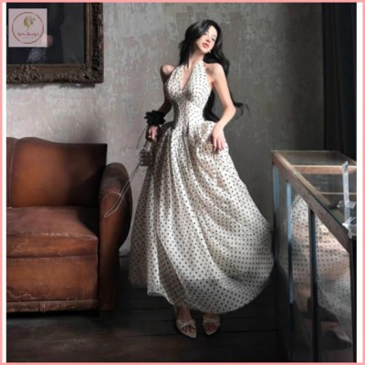 HB6431 Women's temperament long skirt spring and summer waist high-end niche design halter neck V-neck polka dot dress