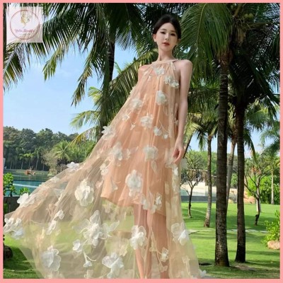 HB6184 Women's Birthday party dress, high-end lace patchwork waist flower bud puffy suspender dress